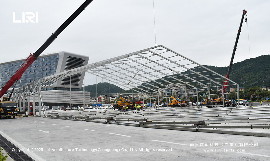 篷房通常采用高强度铝合金材料建造,坚固耐用。通过膨胀螺丝或配重与地面紧密连接,即便遇到10级以上大风,依然能保持稳固不倒。