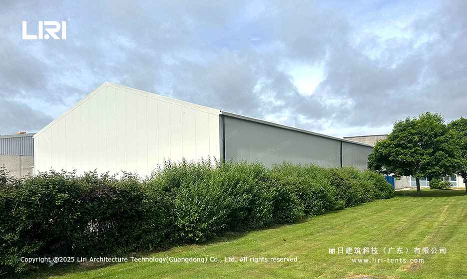 夹芯幕墙外层采用彩钢板,具备抗腐蚀和抗冲击能力,可直接抵御风雨冲击。其夹芯结构与框架紧密贴合,无缝隙渗漏问题,同时整体结构稳定性强,能够显著提高篷房的抗风能力,在暴雨和强风等恶劣天气下表现更加可靠。