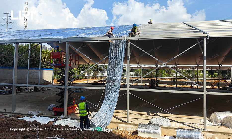 冬季篷房应选用具备良好保温性能的材料。篷房的墙体和顶部可以增加双面铝箔纤维布、保温棉等保温层,同时搭配双面PVC刀刮涂层纤维篷布。这种组合能够有效隔绝冷空气,降低热量流失,为篷房内部提供更好的保温效果。