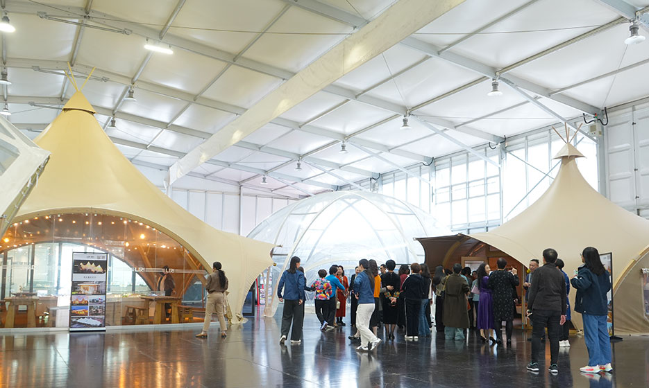 在展厅和车间参观中,企业家们对产品的模块化设计、快速搭建能力以及环保性能表现出极大兴趣,尤其对双层篷房的空间利用率和营地酒店篷房的美学设计赞不绝口。多位企业家现场表示,期待与丽日建筑科技在文旅、体育赛事等领域展开深度合作。