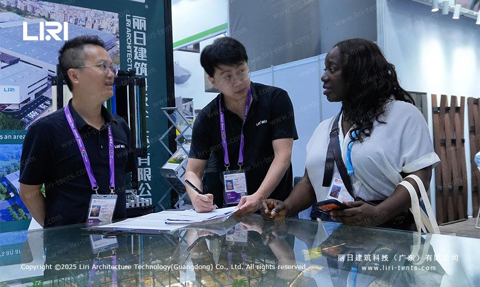 同时,丽日还集中展示了活动会展、体育赛事、体育场馆、工业仓储、机库军工、气膜建筑、酒店帐篷七大板块产品,以完善的产业链布局和全场景覆盖的产品矩阵,吸引众多客商驻足洽谈。凭借新品热度与综合实力,现场收获大量合作意向,签约客户络绎不绝。