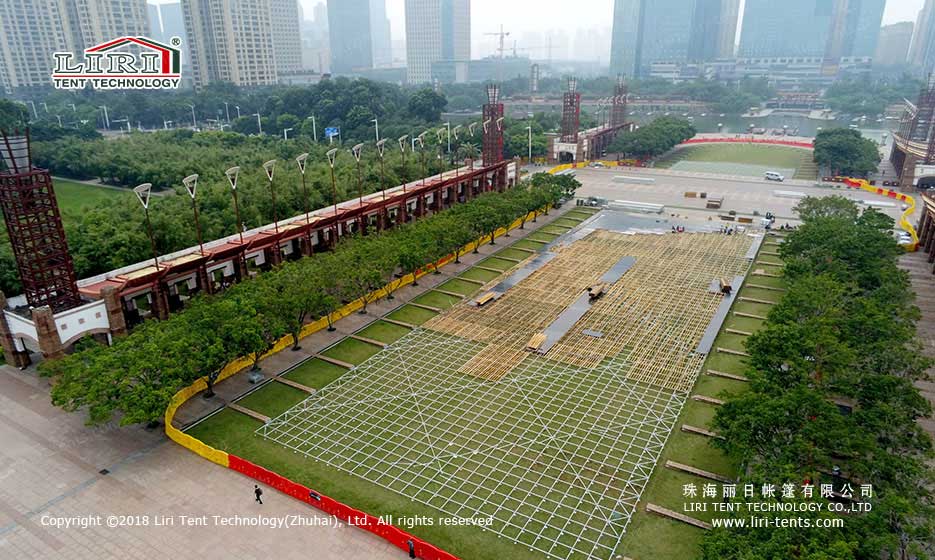 众所周知,我们经常讲的篷房建筑对场地的包容性很强,包括草地、山林里、沙滩、甚至是水上等都可进行搭建,其实并不是这些场地对搭建没有难度,而是当我们把可调节脚手架平台系统运用到篷房建筑里,就可以完美解决地面不平的问题,让很多项目可以不受搭建地点限制,可以顺利开展。