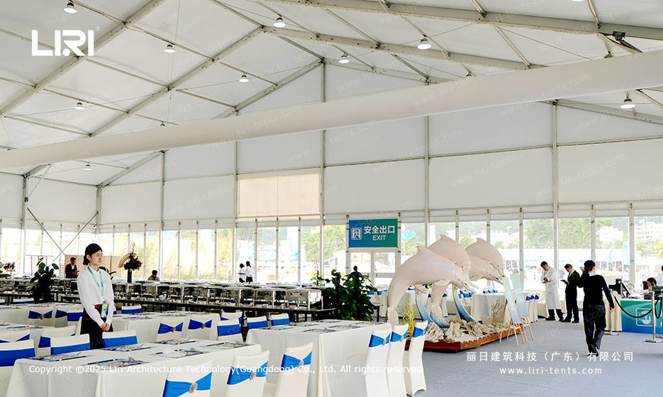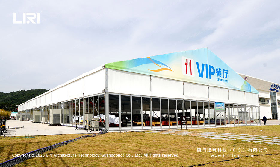 为应对航空展期间庞大的客流量,丽日建筑科技在各出入口搭建了由铝合金篷房构成的多通道矩阵式安检大厅。篷房设计兼具实用性与美观性,不仅合理划分了空间,还大幅提升了通行效率。安检大厅配备了定制双通玻璃门系统,既保障安检快速高效,又为整体场景增添了现代感与大气氛围。公众餐厅与VIP餐厅同样成为亮点,这些区域采用展览篷房结构搭建,并结合玻璃幕墙设计,视野开阔通透,尽显高端品质。餐厅内配备下拉式遮阳帘,可根据光线强弱灵活调节,搭载智能冷暖空调系统,无论外界天气如何,都能为用餐者提供舒适宜人的环境。