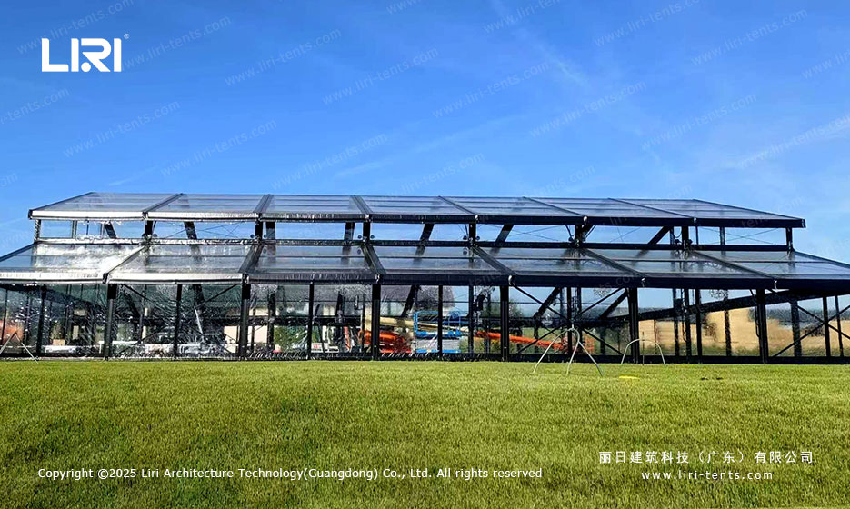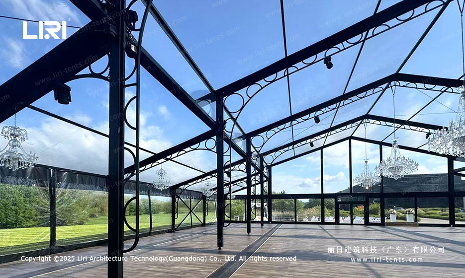 篷房框架采用优雅黑色涂层的6061和6082高强度铝合金材质,既稳固可靠,又兼具美观与耐用性。这样的设计使篷房不受场地限制,能够轻松搭建在多种地形之上,无论是海滨、花园、森林,还是城市中心的空地,黑色橘园篷房都能成为婚礼舞台上的独特风景。