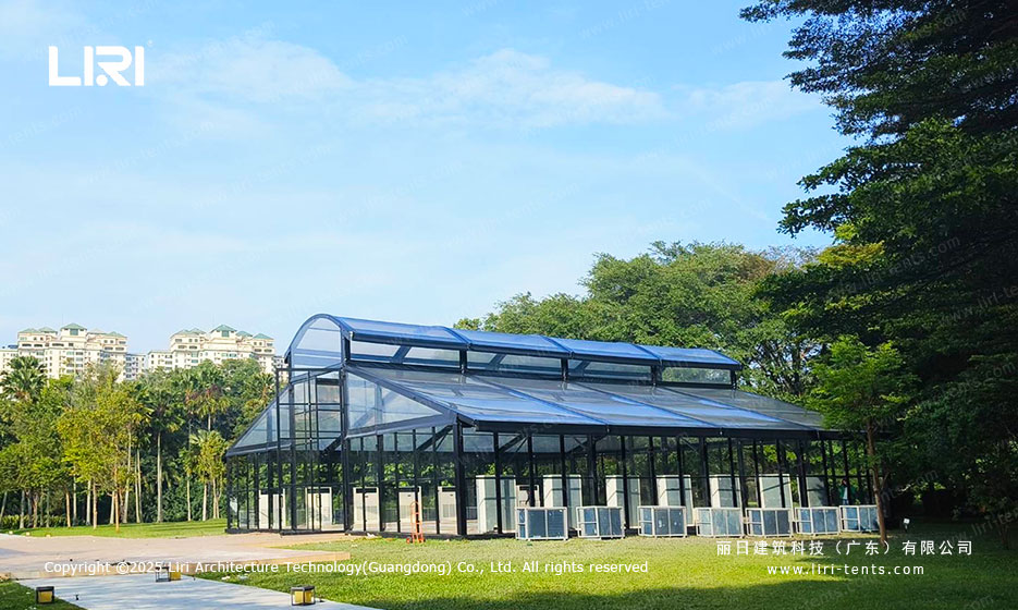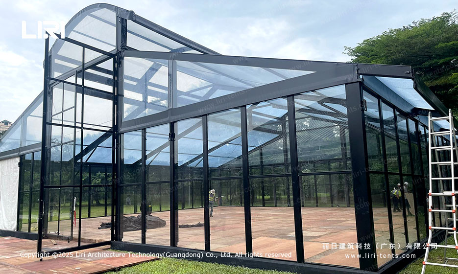 透明橘园篷房不仅美观,更注重实用性与灵活性。6061与6082高强度铝合金框架结构,搭配优雅黑色涂层,既稳固耐用,又适合多种地形场地:无论是海滨、花园、森林,还是城市中心的空地,都能轻松搭建。