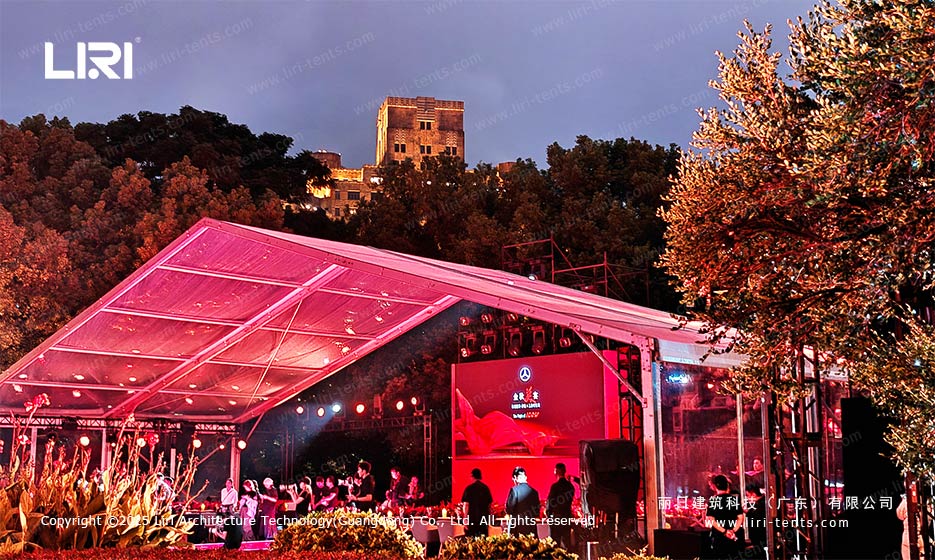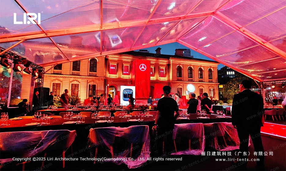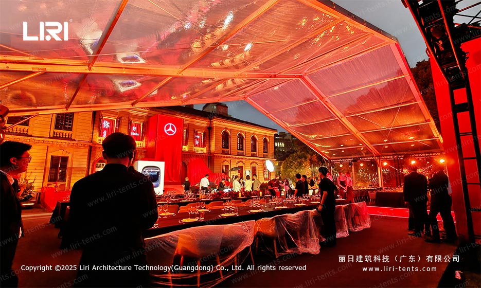 这座户外透明篷房采用 PVC 幕墙与顶篷设计,白天,概念车与外滩的复古建筑在篷房中自然融为一体;夜晚,篷房化身为通透的光影容器,灯光透过材质柔和漫出,营造出如梦似幻的视觉效果。简约流畅的铝合金框架勾勒出优雅大气的轮廓,不仅保障了篷房的稳固性,更与奔驰品牌的简约奢华调性完美契合。